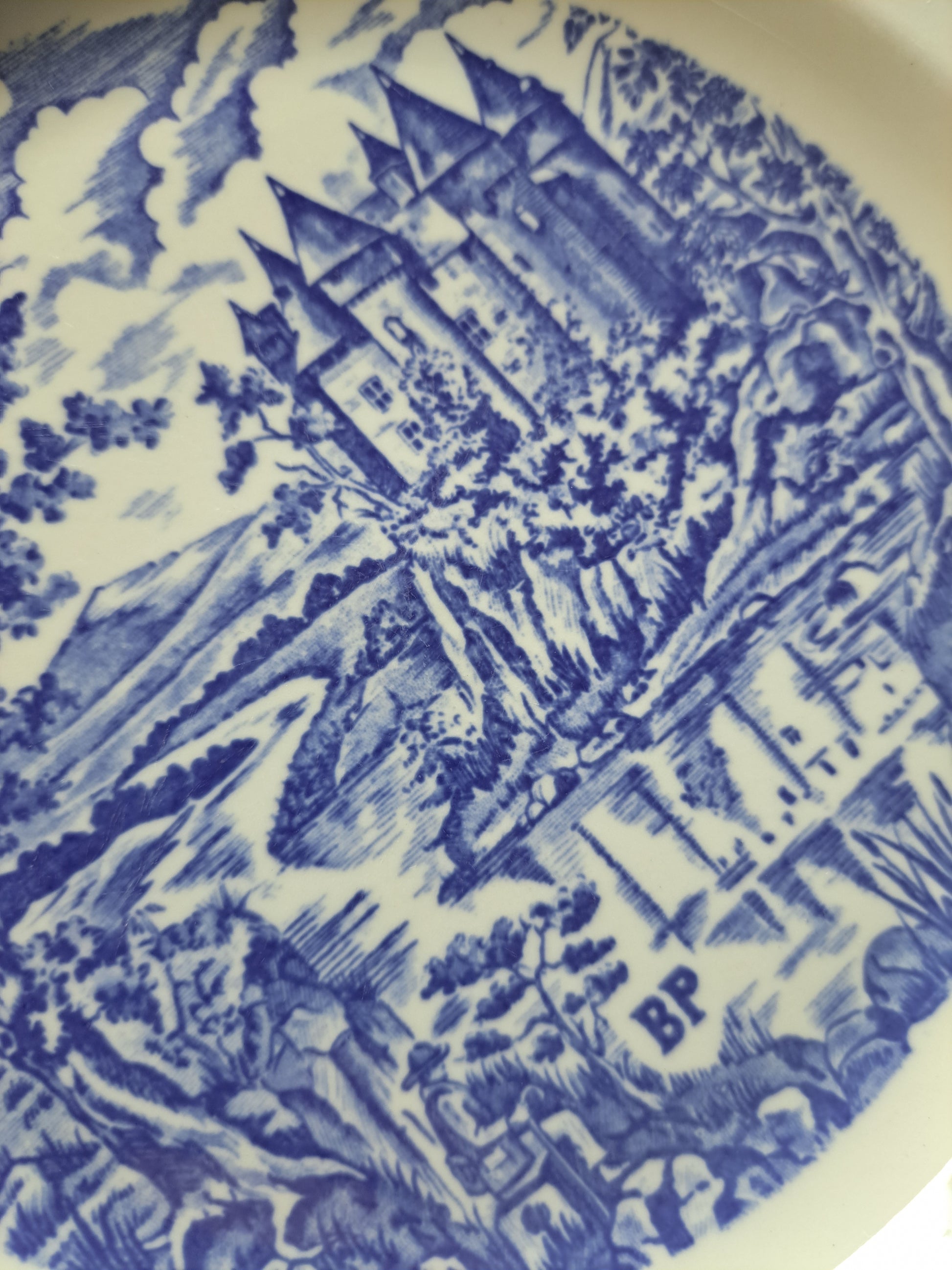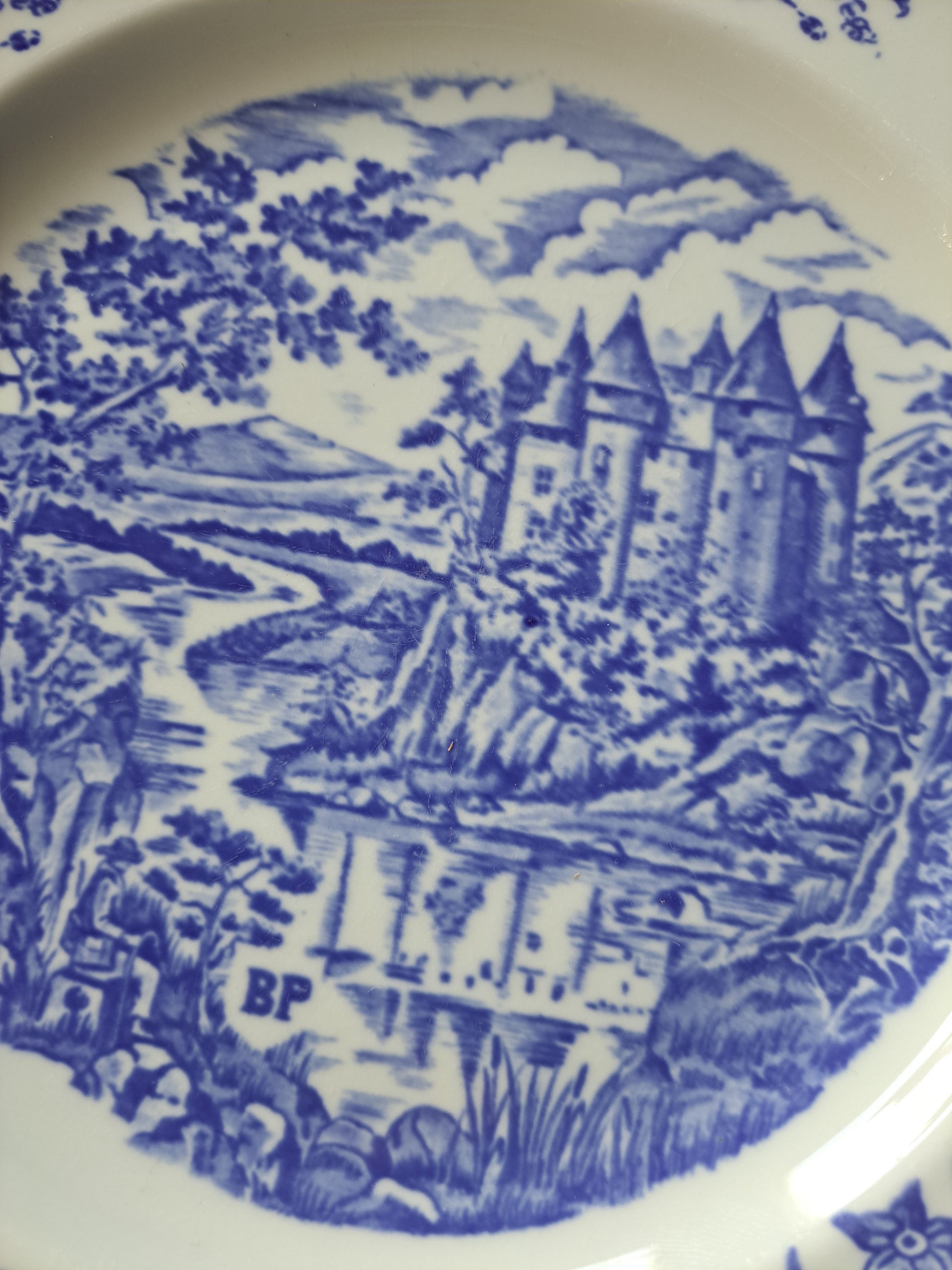 Talerze ozdobne z motywem zamku nad rzeka , zdobienie kobaltowe, średnica 23,5 cm Porcelana Pyroblan